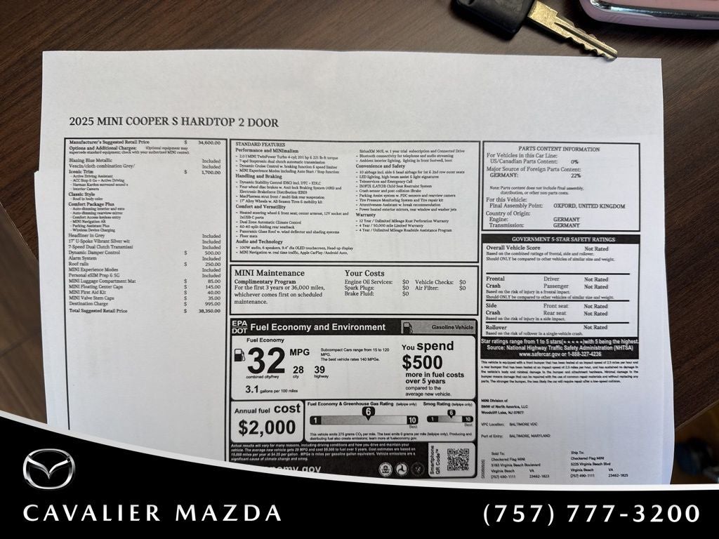 2025 MINI Cooper S Iconic Blazing Blue FWD 7-Speed Automatic 2.0L 16V TwinPower Turbo 4-Wheel Disc Brakes, 6 Speakers, ABS brakes, Active Driving Assistant, Air Conditioning, Alloy wheels, AM/FM radio: SiriusXM, AM/FM Stereo, Apple CarPlay Compatibility, Auto High-beam Headlights, Auto-dimming door mirrors, Auto-Dimming Interior & Exterior Mirrors, Auto-Dimming Rear-View Mirror, Auto-dimming Rear-View mirror, Automatic temperature control, Body Color Roof, Brake assist, Bumpers: body-color, Classic Trim Specific Additional Content, Comfort Access Keyless Entry, Comfort Package, Delay-off headlights, Driver door bin, Driver vanity mirror, Dual front impact airbags, Dual front side impact airbags, Electronic Stability Control, Emergency communication system: MINI Assist eCall, Exterior Parking Camera Rear, Four wheel independent suspension, Front anti-roll bar, Front Bucket Seats, Front Center Armrest w/Storage, Front dual zone A/C, Front reading lights, Fully automatic headlights, Headliner In Grey, Heads-Up Display, Heated door mirrors, Heated Front Seats, Heated front seats, Heated steering wheel, Illuminated entry, Knee airbag, Leather steering wheel, Low tire pressure warning, MINI Assist eCall, MINI Connected, MINI Navigation, MINI TeleServices, Occupant sensing airbag, Outside temperature display, Overhead airbag, Overhead console, Panic alarm, Passenger door bin, Passenger vanity mirror, Power door mirrors, Power moonroof, Power steering, Power windows, Radio data system, Rain sensing wipers, Rear anti-roll bar, Rear window defroster, Rear window wiper, Remote keyless entry, Security system, SiriusXM Satellite Radio w/1 Year Subscription, Speed control, Speed-sensing steering, Speed-Sensitive Wipers, Split folding rear seat, Spoiler, Sport Seats, Sport steering wheel, Sports Steering Wheel, Steering wheel mounted audio controls, Tachometer, Telescoping steering wheel, Tilt steering wheel, Traction control, Trip computer, Variably intermittent wipers, Vescin/Cloth Upholstery, Wheels: 17 x 7 U-Spoke Grey.